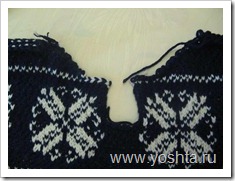 Соединили перед и спинку, выполнили плечевые швы. Хочется обратить внимание :) Жаккард выполнен на всем полотне, даже там, где нет рисунка. Почему же решили вязать так, ведь такое вязание увеличивает расход пряжи, соответственно, вес изделия и его стоимость. Но обратите внимание на плотность вязания в полотне и у вас не будет возникать сомнений в целесообразности данного приема. |  |